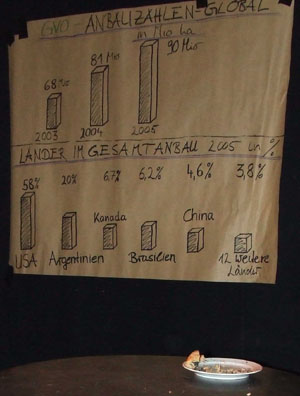 Bei der G8 treffen sich acht einflussreiche Staaten zu informellen Gesprächen zur Gestaltung der Welt und behaupten in den letzten Jahren immer unverfrorener, dass es ihnen auch um die Lösung sozialer Fragen ginge. Bei der Gentechnik, genauer der Gentechnik in der Landwirtschaft, um die es sich an diesem Abend drehte, handelt es sich um eine sehr teure Technologie, deren Besitzer ebenfalls behaupten, Probleme der Menschheit zu lösen - genauer gesagt behaupten sie oft, die Technologie zur Beseitigung von Nahrungsmittelknappheit einsetzen zu wollen. Weder die Regierungen noch die Konzerne können indes Belege für ihr angeblich soziales Engagement vorlegen. Vielmehr ist die soziale Spaltung zwischen Arm und Reich stetig gestiegen, wie unlängst die WIDER-Studie belegte. Nicht zuletzt durch Forderungen der G8-Staaten z.B. nach "Investitionsfreiheit in Industrie- und Schwellenländern" oder wie "afrikanischen Staaten sollen Strukturen entwickeln, die private Investitionen erleichtern" wird der Zugriff von Konzernen zum Beispiel auf diesen Kontinent gefördert. Im Falle des Einsatzes von Gentechnik in der Landwirtschaft wird damit die Ernährungssouveränität der lokalen Bevölkerung zerstört, da sie mit der teuren Technologie nicht konkurrieren kann. |