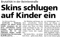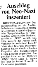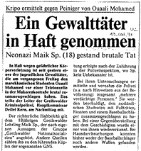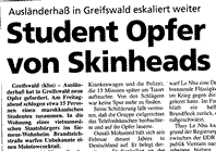 Wer hat Angst vorm braunen Mann? Von Kinderschändern, Drogen und Wölfen im Schafspelz Am 13. Juni diesen Jahres wird mal wieder gewählt und all diejenigen, die gewählt werden wollen, um zu „verändern" oder einfach nur ein wenig Macht zu mißbrauchen, stellen sich dieser Wahl. Spätestens seit dem Kanzlerwechsel wissen wir, daß wir mit diesem System-Parlamentarismus nicht wirklich zu verändern in der Lage sind. Deutschland führt mal wieder Krieg und es scheint so, als hätten die Menschen in diesem Land sich damit abgefunden, daß 54 Jahre nach dem Ende des zweiten Weltkrieges deutsche Soldaten und deutsche Waffen eingesetzt werden, um zu töten. Während nun konservative Großparteien versuchen diesen Krieg zu rechtfertigen, gibt es Parteien, die sich gegen eben diesen Krieg aussprechen. Eine dieser Parteien, kurz NPD, nimmt nun Anlauf zum Sprung in die Parlamente Mecklenburg/ Vorpommerns und bedient sich dabei recht fragwürdiger Mittel. Viele NPD-Funktionäre und Mitglieder haben mit Gewalt und Krieg kein Problem, haben doch eine Menge von Ihnen militärische oder gar paramilitärische Ausbildungen und auch schon an Kriegseinsätzen teilgenommen, bzw. saßen wegen Körperverletzung und Mord schon im Knast. Also basiert die Ablehnung des Krieges nicht auf einer pazifistischen Grundhaltung, doch eher auf einer konträren Einstellung zur System-Politik. Die NPD ist eine nationalistisch faschistische Partei, deren Ziel nicht gerade die Abschaffung des Staats-Kapitalismus, der Grund allen Übels, ist, sondern eher das Erlangen der Kontrolle durch Macht. Es ist schon eine sehr gefährlich große braune Masse, die sich auf uns zubewegt und es reicht nicht aus, sie zu stoppen, sie muß entsorgt werden. Ich denke da gerade an den lokalen Vortänzer der NPD, Maik Spiegelmacher, Jahrgang ’73, der sich nicht zu schade ist, für eine auch seine Leute betreffende Todesstrafe auf die Straße zu gehen. Die NPD fordert nämlich auf einigen Ihrer Wahlplakate „Todesstrafe für Kinderschänder“ und was das heißt, haben Maik und Konsorten scheinbar noch nicht verinnerlichen können, denn gerade sie haben schon so einige Kinder verletzt, bzw. durch Handlanger verletzen lassen. Er selbst stand im April 1992 als Anführer der „Greifswalder Nationalsozialisten“ vor Gericht, da u.a. mehrere Überfälle auf Mitmenschen auf sein Konto gingen, so auch der versuchte Todschlag an dem marokkanischen Studenten Ouaali Mohamed im Oktober 1991 in der Makarenkostraße. Im Dezember des gleichen Jahres stiftete er drei Jugendliche aus dem Lager der Greifswalder Nationalsozialisten im Alter von 14, 16 und 17 Jahren zu einem Brandanschlag auf das damalige AsylbewerberInnenheim in der Brandteichstraße an, wohlwissend, daß sich zu dem Zeitpunkt Menschen in dem Haus befanden. Daraufhin wurde Maik Spiegelmacher von der Polizei in Gewahrsam genommen. Die Kette an Körperverletzungen, die auf das Konto des Maik Spiegelmacher gehen, zieht sich bis heute wie ein Wurm durch den Greifswalder Alltag. 1998, im Vorfeld der Bundes- und Landtagswahlen zog Maik Spiegelmacher, obwohl er noch unter Bewährungsauflagen stand, durch die Greifswalder Innenstadt, um vorsätzlich Menschen zu verletzen, was auch mehrfach in die Tat umgesetzt wurde. Mittlerweile finden wieder NPD-Infotische im Schuhagen statt und der braune Mob gibt sich mit einer arroganten Selbstherrlichkeit als „Saubermänner“ in Jacket. Kein Hinweis auf Verbrechen, Straftaten und laufende bzw. abgeschlossene Verfahren. Doch bei genauerem Hinsehen muß eigentlich klar sein, daß diese Typen nur von dummen, faschistoiden Unverbesserlichen gewählt werden und wer sie wählt, macht sich zu ihren Handlangern, zu ihrem Werkzeug. Es steht auf einem anderen Wahlplakat geschrieben: „Keine Macht den Drogen“, dies schreibt sich eine Partei auf die Fahnen, deren Mitglieder und SympathisantInnen scheinbar nichts so gut können, wie sinnlos in sich „reinsaufen“ oder sich auch mal andere Substanzen, ganz inoffiziell versteht sich, „einwerfen". Täglich sind be- und angetrunkene Faschisten, NPD-Mitglieder und SympathisantInnen im Greifswalder Stadtbild sichtbar und fallen durch stumpfsinnige Sprüche und Parolen auf, wozu sie trotz oder gerade durch Alkoholkonsum in der Lage sind, bzw. langen sie auch schon mal hin, wenn Ihnen jemand nicht genehm ist oder einfach nur „anders“ aussieht. In Stralsund wurde gerade erst ein junger Mensch faßt zu Tode geschlagen und in Karlsburg wiederum ist jemand mit einer Axt beinahe getötet worden, in Greifswald sind wiederholt junge Menschen verletzt worden und die Täter sind wenigstens NPD-Sympathisanten. Eine Menge Dinge gäbe es über dieses Lager zu berichten, so daß nicht einmal diese Ausgabe ausreichend Platz bieten könnte und da mir immer speiübel wird, wenn ich an diese Typen denke, werde ich mich jetzt übergeben und melde mich diesbezüglich lieber wieder in der nächsten Ausgabe. dm (Die Zeitungsartikel rechts sind aus der OZ und dem Tageblatt vom 14. und 19. 10. 1991 sowie 19. 4. und 9. 12. 1991) |